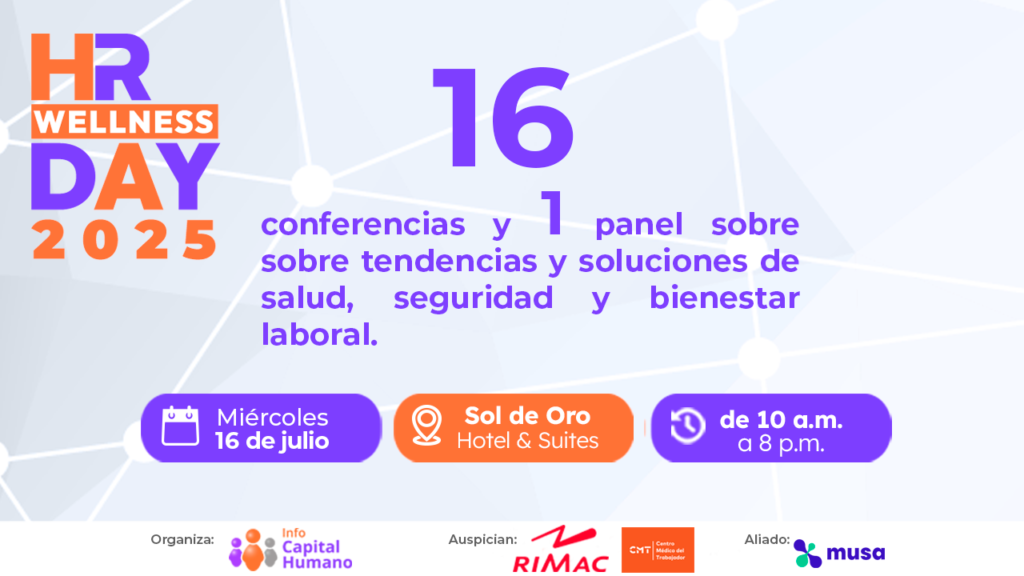 Como ya es usual, la participación en estas conferencias no tiene costo, pero es indispensable registrarte previamente como visitante del HR Wellness Day 2025. El único requisito es pertenecer al área de Recursos Humanos. Una vez inscrito, solo debes acercarte el miércoles 16 de julio al Sol de Oro Hotel & Suites, en Miraflores, y dirigirte a los salones ubicados en el segundo piso.