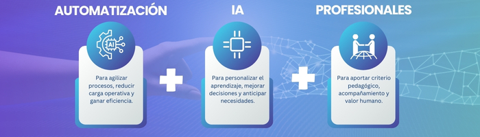 Automatización para agilizar procesos + IA para personalizar el aprendizaje + Profesionales (valor humano diferencial) para acompañar, interpretar y dar sentido a la experiencia.